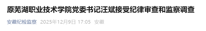 据安徽纪检监察微信号12月9日消息,原芜湖职业技术学院党委书记汪斌涉嫌严重违纪违法,目前正接受安徽省纪委监委纪律审查和监察调查。(安徽省纪委监委)